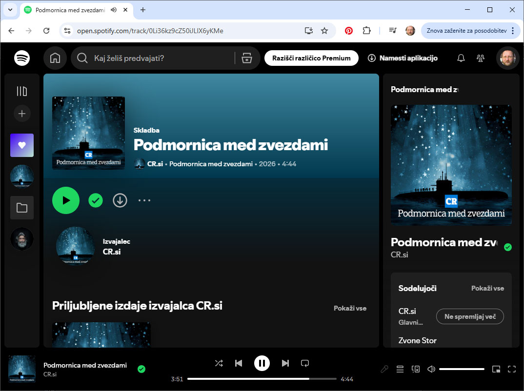 Pesem Podmornica med zvezdami skupine CR.si je objavljena na Spotify in ji lahko prisluhnete. Če boste pesem všečkali in delili s prijatelji, boste s tem izkazali največjo podporo projektu potovanja po vesolju ... Bravo!